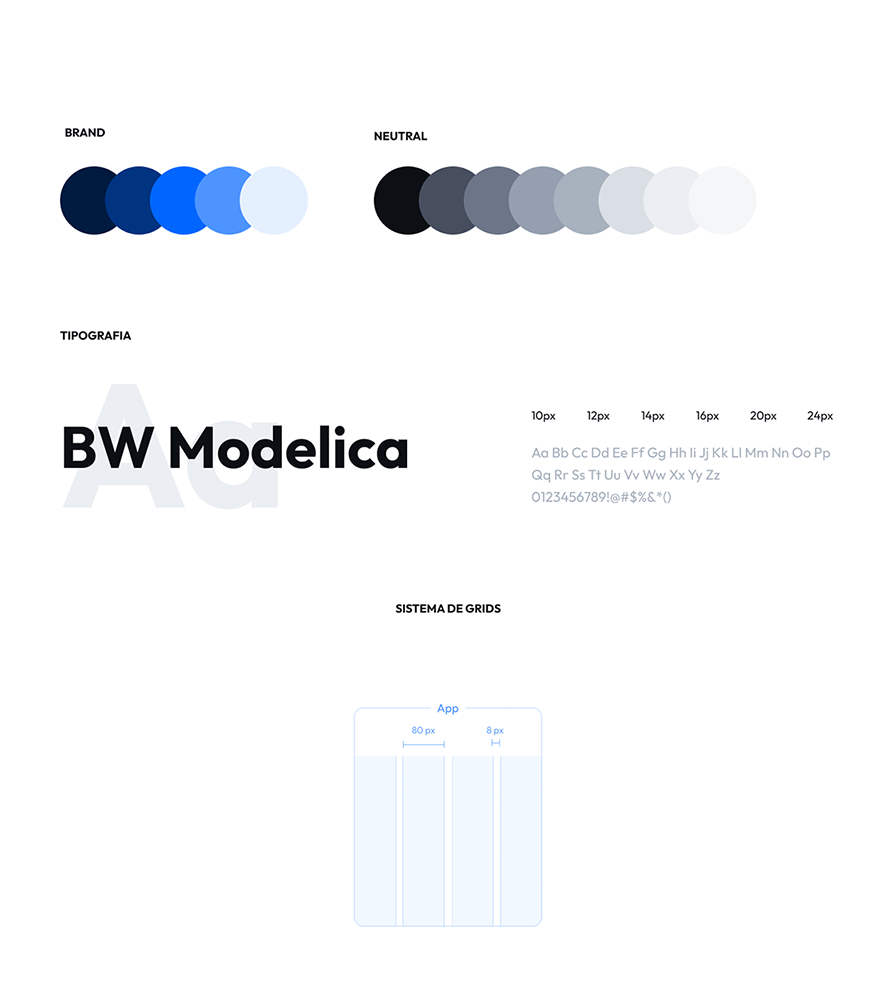 3. Experiência e Interface - O visual foi construído com base em uma paleta sóbria, elegante mas, principalmente, acessível, combinando tons de azul, branco e cinza, da maneira correta, refletindo confiança, sofisticação e profissionalismo. A tipografia BW Modelica foi escolhida a dedo para reforçar o aspecto técnico e moderno do sistema, trazendo a beleza das suas formas bem desenhadas sem abrir mão da legibilidade.